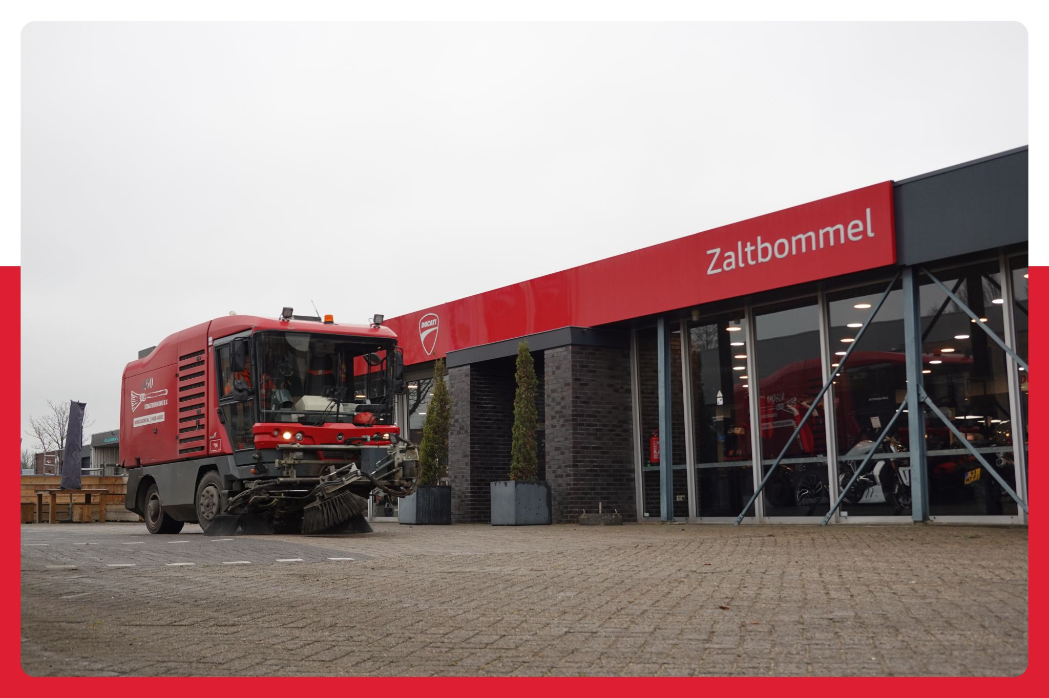 Voor de opening van de nieuwe vestiging van Ducati in Zaltbommel heeft Vado het volledige buitenterrein gereinigd. Voor deze bijzondere Ducati flagship store in Nederland moest het terrein er representatief en schoon uitzien voor bezoekers van de open dag. Met onze professionele veegmachines hebben wij het terrein grondig schoongemaakt en onkruid tussen de bestrating verwijderd. Door het terrein te borstelen en te vegen werd vuil, zand en onkruid effectief verwijderd. Een schoon bedrijfsterrein is belangrijk voor de uitstraling van een locatie. Zeker bij een evenement of opening zorgt een goed onderhouden terrein voor een professionele eerste indruk.